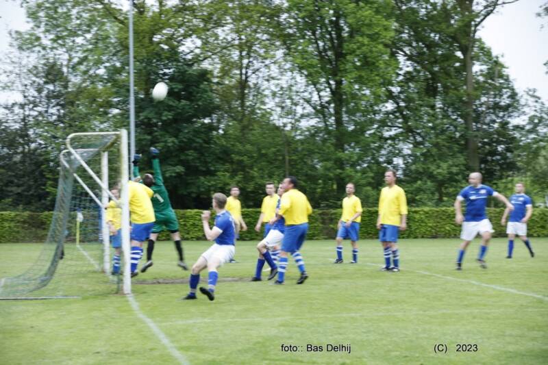 In de rust is er enige gelatenheid over ons optreden, we werken hard zijn tevreden met de inzet en hoe het staat. Tijdens de thee, wisselen we wat nodig is. De tegenstander wisselt liefst 6x Dit komt hun spel niet ten goede. Het tempo is veel lager en ondanks dat we niet tot aanvallen komen, spelen we een aardig potje mee. Door een hopeloze aanname van een Olympiaan, kan ik een zeker doelpunt nog tot 2x toe voorkomen. Ook een corner net onder de lat tik ik weg. Slechts 1x moet ik capituleren, als een bal uit een corner niet weggewerkt wordt. De bal wordt richting de hoek wordt geschoten. Ik kan nog wel de bal toucheren, maar onderwijl er een uitgestoken voetbalschoen door mijn ribben heen gaat, gaat de bal binnen. 0-3 wedstrijd, voor zover er een wedstrijd was, gespeeld. We proberen het nog wel en het is een mirakel hoe een Olympiaan de bal van de lijn haalt, anders hadden we gescoord ook nog. Die vreugde valt ons niet ten deel. Als de scheidsrechter op zijn fluit blaast kan feest voor de tegenstander losbarsten. We feliciteren ze met het dik verdiende kampioenschap en ik wens mijn collega die deel uitmaakt van het team veel plezier met de avond die voor hen in Nijmegen tot in de kleine uurtjes zal duren. Er klinkt vuurwerk op het sportpark als we onze kleedkamer binnen lopen.