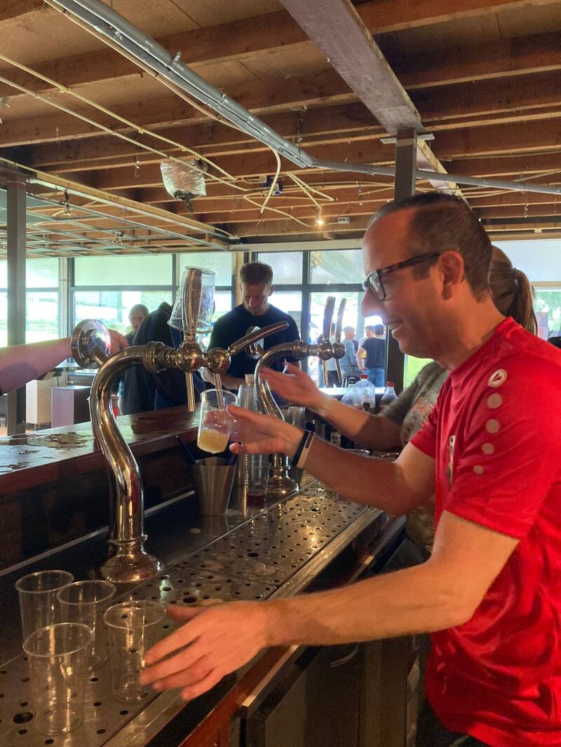 De finale zal ik niet zien, omdat ik achter de bar ga staan. Dit jaar van keeper naar barkeeper. Dit is met zo’n toernooi geen straf. Ja het is wat behelpen, doordat de renovatie van het clubgebouw gaande is de ruimte krap, maar je hebt meer dan genoeg aanspraak en je bent een meerwaarde voor het evenement. Althans als je wel wat handigheid hebt achter de bar. Daarnaast staan er gezellige medemensen achter. Er zitten mensen vrolijk te keuvelen aan de bar en door afdoende bezetting kan de bar even ‘loslaten’ ook. Daarbij is iedereen die komt bestellen goed geluimd en maakt meestal een praatje. Nou geen straf dus. Ons team blijkt de finale gewonnen te hebben. Mijn (bar)keepershirt van Spanje kan uit. Ik krijg mijn kerkuilenshirt toegegooid. “Trek deze maar aan!” Ik ga mee op de foto en mag de gigantische beker aanraken. Tevreden loop ik terug in mijn shirt naar de bar. Uiteraard krijg ik wel wat opmerkingen als ‘successupporter’ te horen, maar dat is voetbalhumor en die hoort bij een dag als deze.