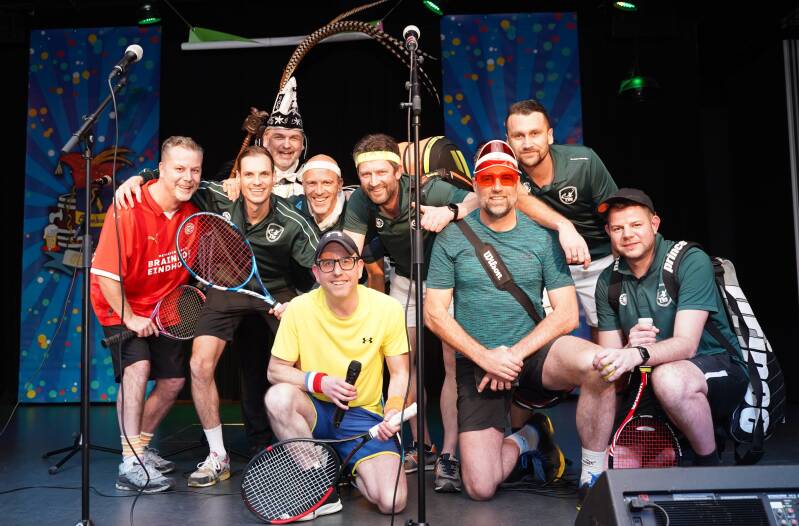 We doen de gordijnen dicht en stellen de microfoons op. De special act is er klaar voor. Het gordijn gaat los en het is fantastisch om de hofhouding te zien. Dit zijn de krenten in de pap. Heerlijk om te zien, het nummer is grappig en na afloop volgen wat hugs. Hierna is het tijd voor de volgende acts en loopt het mooi door. Tussendoor doe ik mijn Raadspak uit en mijn tennistenue aan. Dit is wellicht een gedoe van jewelste, maar voor iemand die de avond promoot, ik doe mee waar kan meedoen. Ik vergeet de voorgaande act af te kondigen. (minpuntje) Het nummer is echt zo'n nummer voor leuk voor een avond als deze. Het kan op heel veel waardering rekenen. We komen aan bij debuterende groep jeugdigen. Zoals we dit jaar 3 debuterende groepen hebben. Iets waar we echt trots op mogen zijn. Zelfs mag ik, voor het eerst, meedoen met de ex-Prinsen en ex-Prinsessen. Voor mij dus een kleine debuutrol.